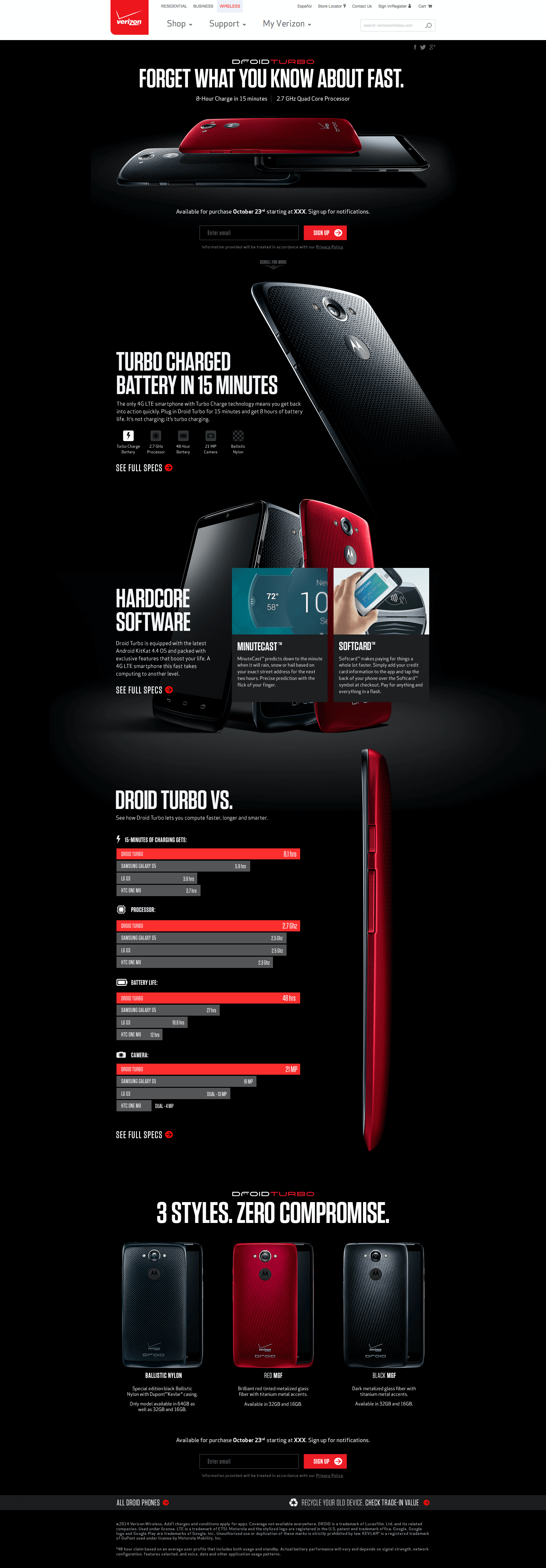 Before the Droid Turbo launched, I designed a teaser countdown landing page. The device was shrouded in mystery but potrayed it a premium look. Visitors were able to sign up to recieve a notification when the device launched.
